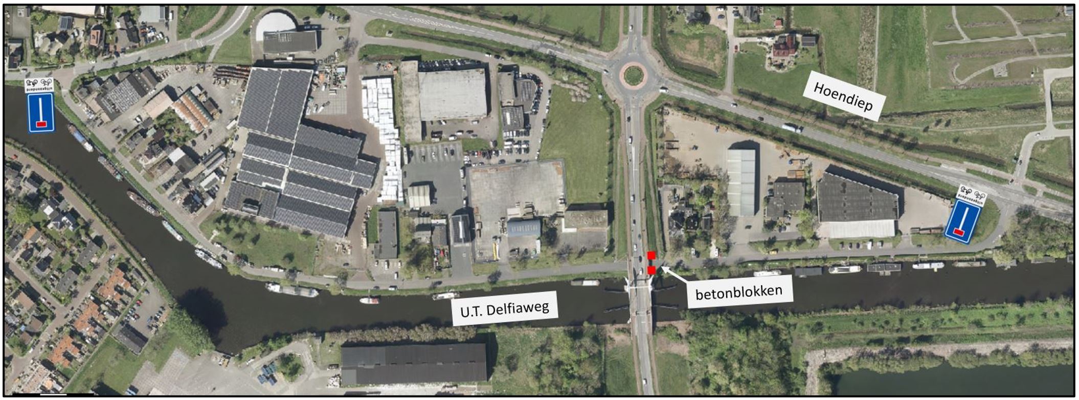 Naar verloop van de werkzaamheden aan de zuidelijke ringweg, heeft Aanpak Ring Zuid in april 2024 twee betonblokken geplaatst op de U.T. Delfiaweg ter hoogte van de Jan Altinkbrug. Dit om sluipverkeer van personenauto’s en motoren te voorkomen. Naar aanleiding van positieve berichten vanuit de buurt, heeft de gemeente Groningen deze situatie gemonitord om te onderzoeken of een permanente vorm van deze maatregel geschikt is voor de toekomst om eventueel doorgaand-/ sluipverkeer binnen de 30 km/u zone te beperken. Uit de monitoring is naar voren gekomen dat de verkeersveiligheid is verbeterd door een lagere snelheid en een lagere verkeersintensiteit. Vooral in de ochtend- en avondspits, maar ook s’ nachts, is de drukte afgenomen. Datagegevens wijzer erop dat de V85 (snelheidswaarde die door 85% van de automobilisten niet wordt overschreden) ten opzichte van een jaar geleden met ca. 5 km/u is afgenomen. Hiermee zijn de verkeersveiligheid en leefkwaliteit aan de U.T. Delfiaweg verbeterd. Voor de aan de U.T. Delfiaweg gevestigde bedrijven zorgt de afsluiting voor geen tot weinig hinder. Op basis van reacties op een gemeentelijke brief naar de direct aanwonenden en gevestigden is dit naar voren gekomen. Hieruit is eveneens naar voren gekomen dat een groot deel van de omwonenden positief staat tegenover het instellen van een permanente doodlopende U.T. Delfiaweg. De tijdelijke maatregel vanuit Aanpak Ring Zuid wordt middels dit verkeersbesluit permanent gemaakt.