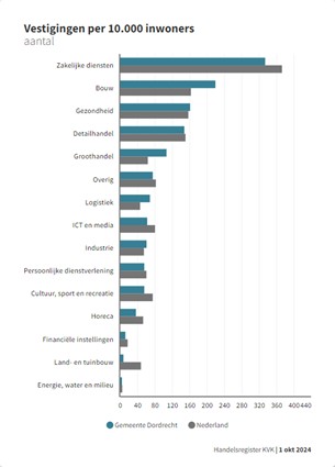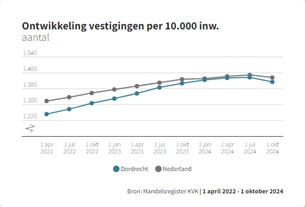 Dordrecht doet het economisch relatief goed de laatste jaren. De groei van het aantal bedrijfsvestigingen lag in de periode 2018-2024 gemiddeld een procentpunt boven het landelijk gemiddelde en boven de groei van het aantal inwoners. Dat was nodig, want Dordrecht stond op achterstand; dankzij de inhaalgroei komt Dordrecht nu uit net onder het landelijk gemiddelde aantal bedrijfsvestigingen afgezet tegen het aantal inwoners.