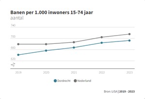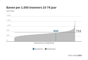 Tegelijkertijd zit Dordrecht met de werkgelegenheid anno 2024 nog steeds ca. 3.000 banen onder het landelijk gemiddelde. De toename van het aantal banen loopt de laatste jaren parallel aan de landelijke trend, dus inhaalgroei is nog niet voorzien. Voor Zuid-Hollandse begrippen kent Dordrecht een gemiddelde balans tussen wonen en werken, maar ook hier loopt Dordrecht achter op andere gemeenten van gelijke omvang.