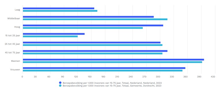 In Dordrecht ligt zowel de bruto-arbeidsparticipatie (het aandeel van de (werkzame en werkloze) beroepsbevolking in de bevolking) als de netto-arbeidsparticipatie (het aandeel van de werkzame beroepsbevolking in de bevolking) onder het landelijk gemiddelde: 74,9% tegen 75,8% landelijk voor de bruto-arbeidsparticipatie, 72,0% tegen 73,1 landelijk netto.31