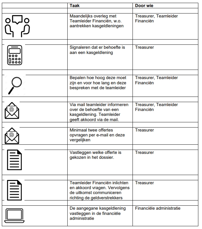 De treasurer mag zelfstandig kas- en daggeldleningen afsluiten. Om inzicht te geven in het proces van het aangaan van een kasgeldlening is een eenvoudig stroomschema als bijlage opgenomen. Zie bijlage 1