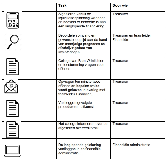 Voor het aantrekken van lang geld wordt eerst toestemming gevraagd aan het college van B en W . Daarna zal bij minimaal twee instellingen een offerte worden gevraagd. Deze offertes worden op een vooraf bepaald tijdstip schriftelijk doorgegeven aan de treasurer. De laagste offerte wordt gekozen. Daarna zal er een nota voor het college worden gemaakt waarin de offertes worden vermeld en voor welke offerte is gekozen.