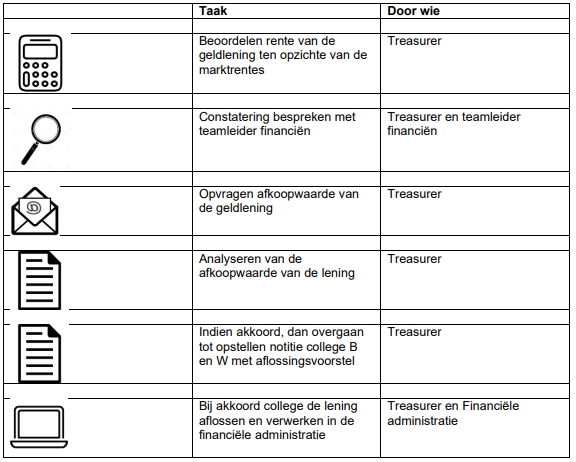 De treasurer beoordeelt periodiek de rente van de langlopende leningen. Indien wordt gesignaleerd dat de rente van een lening hoger is dan de op dat moment geldende marktrente, wordt een aflossingsvoorstel opgevraagd bij de desbetreffende geldverstrekker. In dit voorstel worden de kosten van de vervroegde aflossing geanalyseerd. Indien de financiële positie hierdoor verbeterd kan worden, wordt het bevoegde orgaan een voorstel aangeboden.