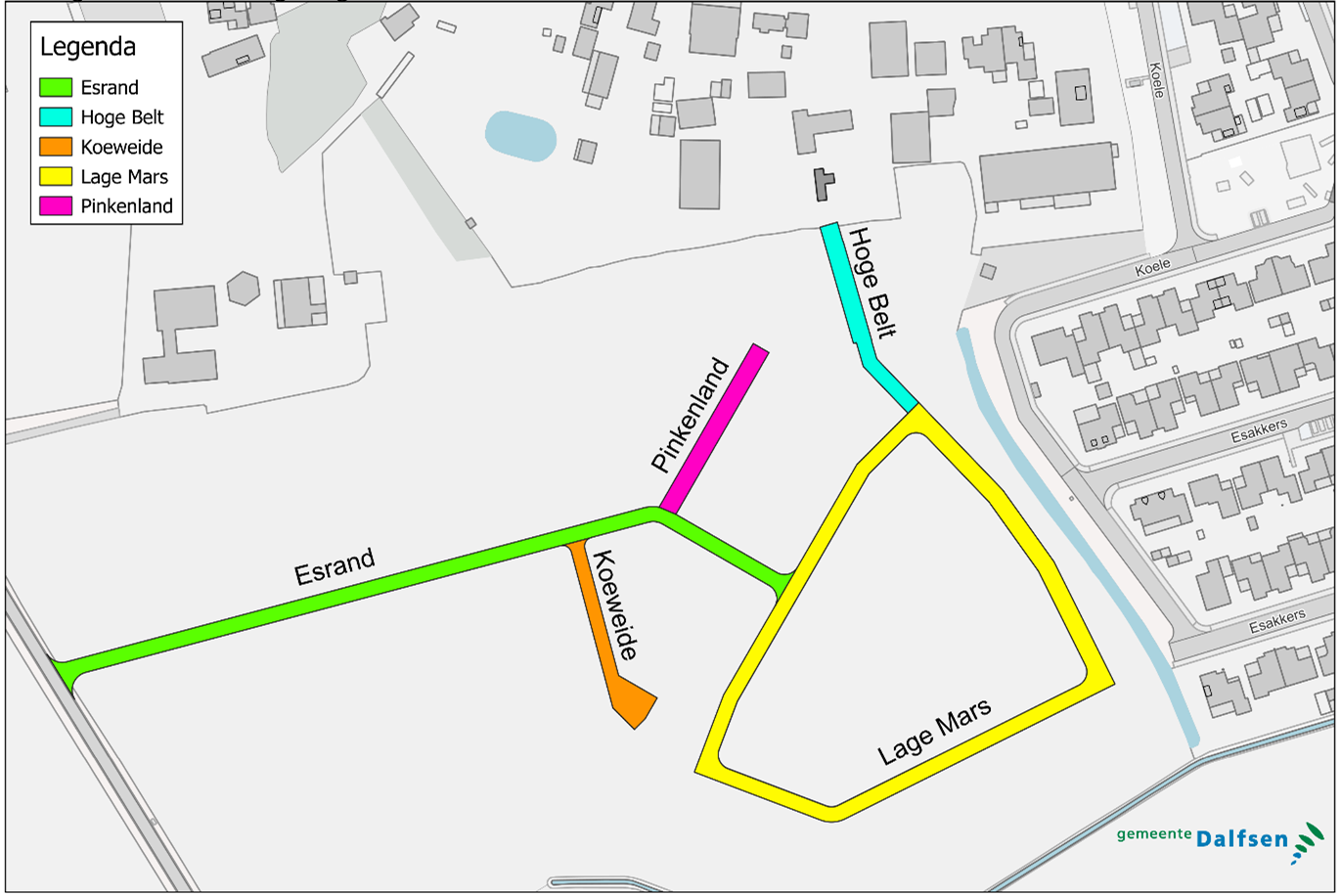 de op onderstaande plattegrond aangegeven openbare ruimten met ingang van 23 april 2025 te benoemen als ‘Esrand, Pinkenland, Koeweide, Lage Mars en Hoge Belt’