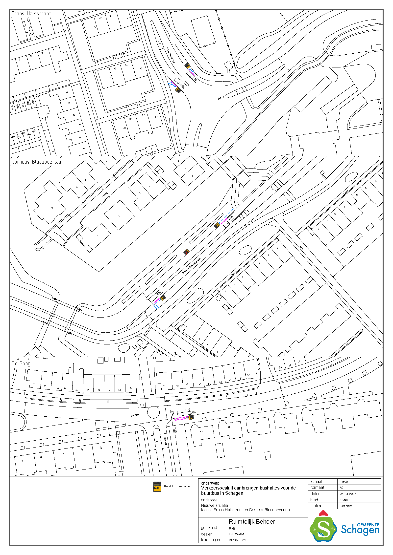 Gemeente Schagen- Verkeersbesluit aanleg bushaltes buurtbus op de Frans Halsstraat, Cornelis Blaauboerlaan en De Boog, Schagen.