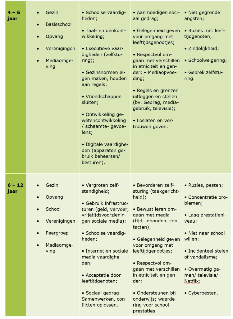 Onderstaand overzicht, uit ‘Opgroeien en opvoeden’ van het NJI, is niet uitputtend maar geeft voorbeelden van ontwikkelingstaken en opvoedingsopgaven die kenmerkend zijn voor de verschillende leeftijdsgroepen. Vaak begint de ontwikkeling al in een eerdere fase, maar staat het in het schema in de fase waarin dit het meeste speelt. Dit schetst een beeld van ‘normale’ uitdagingen die onder de ouderlijke verantwoordelijkheid vallen en waarbij in beginsel géén aanspraak bestaat op jeugdhulp.