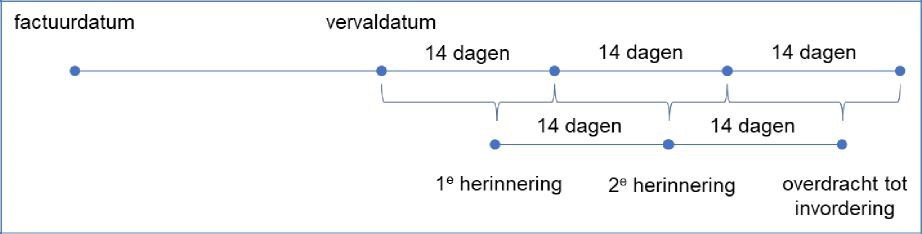Het proces van betalingsherinneringen wordt eens in de 2 weken gestart. Er is sprake van een 2-wekelijkse cyclus. Hierbij wordt er een overzicht gemaakt van alle openstaande privaatrechtelijke vorderingen waarvan de vervaldatum is verstreken.