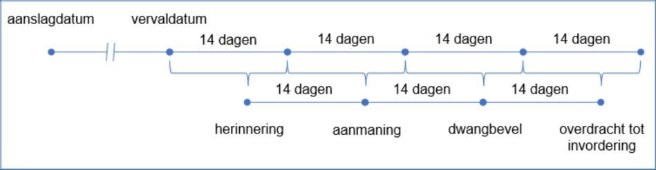 Het proces van aanmaningen wordt eens in de 2 weken gestart. Er is sprake van een 2-wekelijkse cyclus. Hierbij wordt er een overzicht gemaakt van alle openstaande aanslagen waarvan de vervaldatum is verstreken.