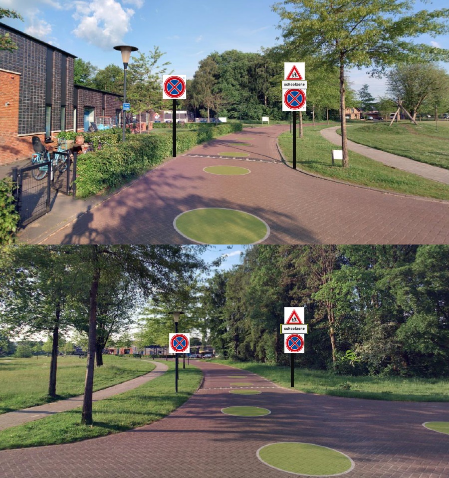 Een deel van De Lanen rond de school wordt ingericht in als schoolzone. Een schoolzone is een speciaal gemarkeerd gebied rondom de school waar extra aandacht wordt gevraagd voor schoolgaande kinderen. De zone wordt aangegeven op de weg en met bebording. In de schoolzone wordt gekozen voor een verbod om stil te staan aan beide kanten van de weg. Zo voorkomen we dat auto’s in de berm of aan de kant van de weg stilstaan waardoor het overzichtelijk blijft.