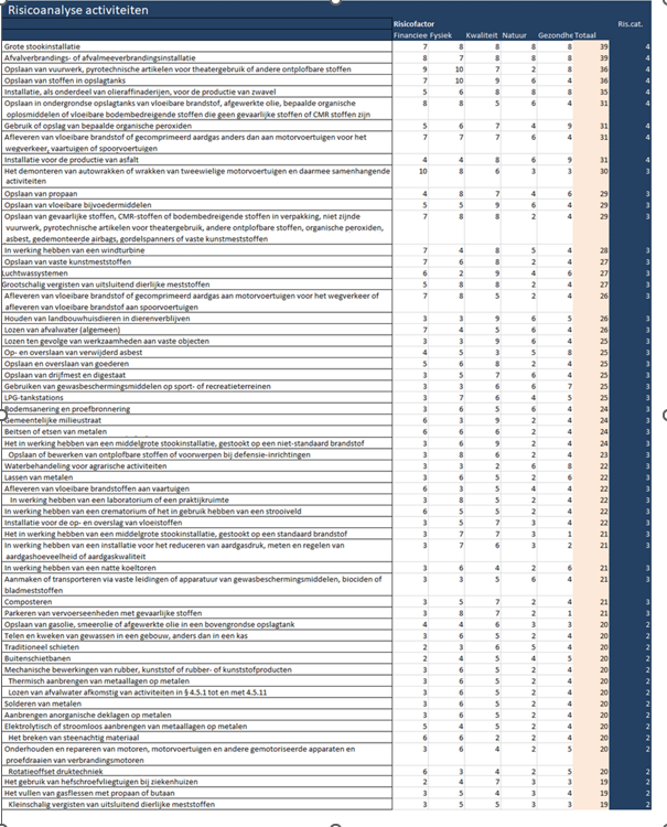 Deze aspecten leiden met een weging van het potentieel nadelige effect tot een risicocategorie per branche. Het totaal van de risicofactoren leidt tot een risicoscore, waarbij een indeling is gemaakt in: