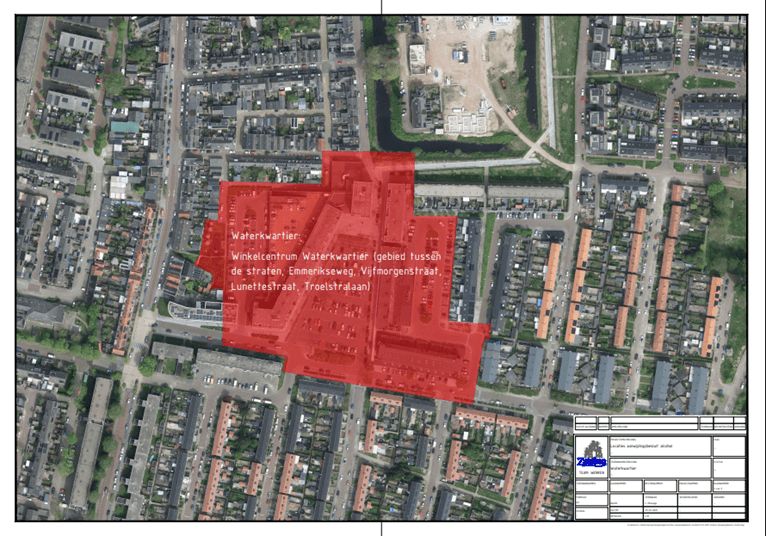 Winkelcentrum Waterkwartier: het gebied omsloten door en inclusief de straten: Emmerikseweg, Vijfmorgenstraat, Lunettestraat en Troelstralaan.