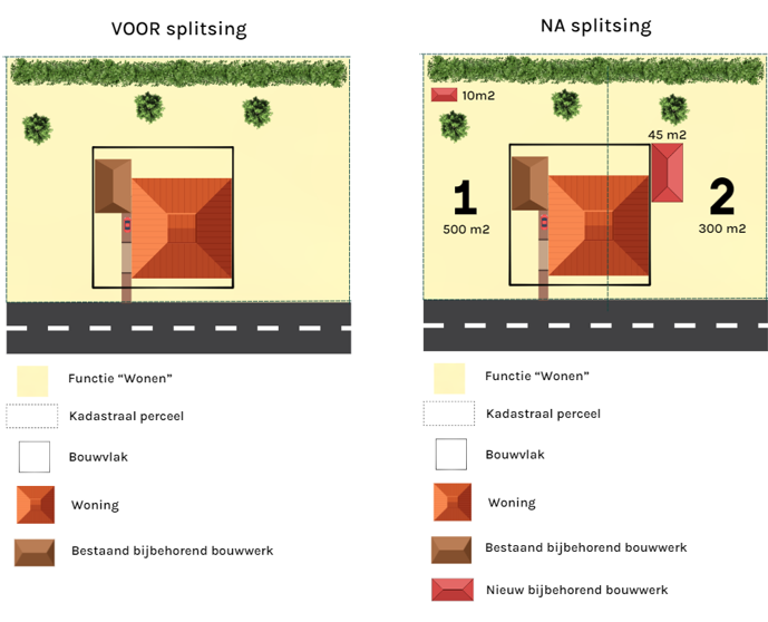 Bij splitsing wordt het aantal m2 aan bijbehorende bouwwerken naar rato in percentage verdeeld over de gesplitste percelen. |