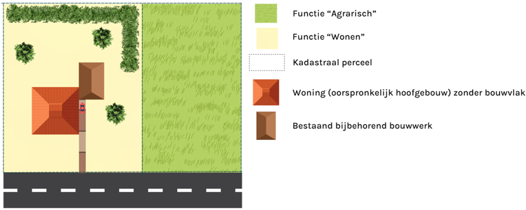 Buiten de bebouwde kom wordt geen onderscheid gemaakt tussen de vraag of het bijbehorend bouwwerk binnen of buiten het bouwvlak staat. Voor de berekening van het maximale aantal toegestane vierkante meters wordt de volledige functie “Wonen” meegerekend.