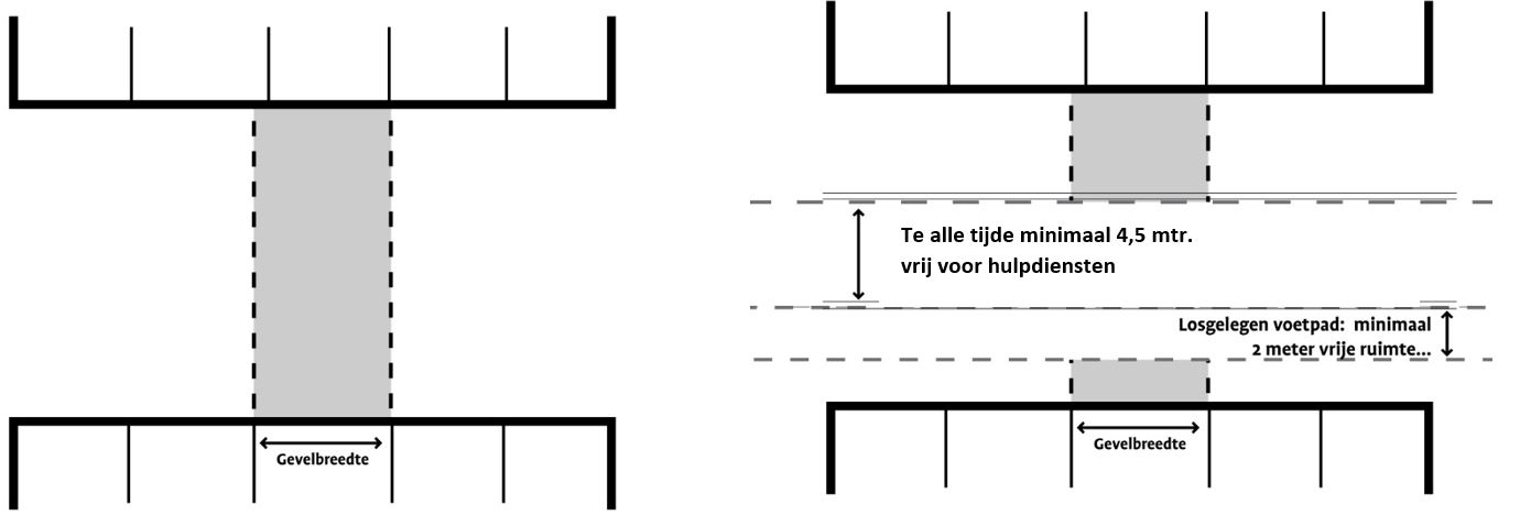 Doorgang: In verband met een veilige en onbelemmerde doorgang van de hulpdiensten dient er te allen tijde een vrije doorgang van minimaal 4,5 meter breed aanwezig te zijn. Indien deze vrije ruimte in het geding komt kan het bevoegd gezag besluiten de vergunning niet te verlenen of de aanvraag gedeeltelijk af te wijzen of in overleg met de aanvrager de aanvraag te wijzigen.
