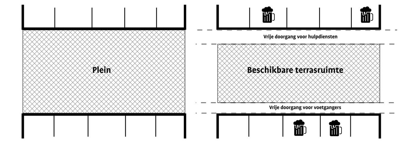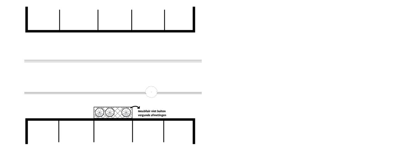 Vrije ruimte: Indien het terras wordt geplaatst op de openbare weg of de stoep moet er altijd voldoende ruimte overblijven voor een veilige passage van voetgangers, rolstoelgebruikers, fietsers en gemotoriseerd verkeer. Deze mogen niet in elkaars rijbaan komen om langs het terras te komen.