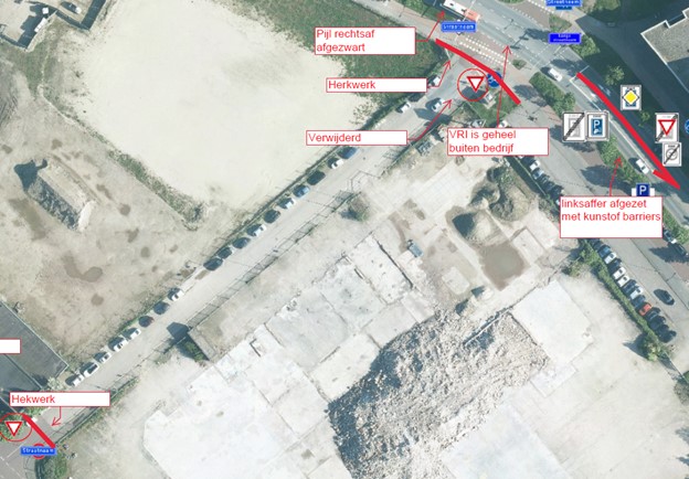 De voorsorteerstrook voor linksafslaand verkeer op de noordelijke rijstrook van de Westervoortsedijk ter hoogte van de Badhuisstraat af te sluiten met wegafzettingen;