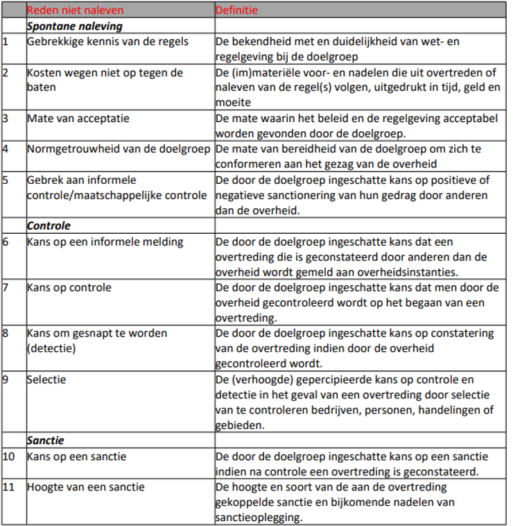 De zogenoemde Tafel van Elf heeft in totaal elf mogelijke redenen van niet naleven ten regels onderscheiden, te weten: