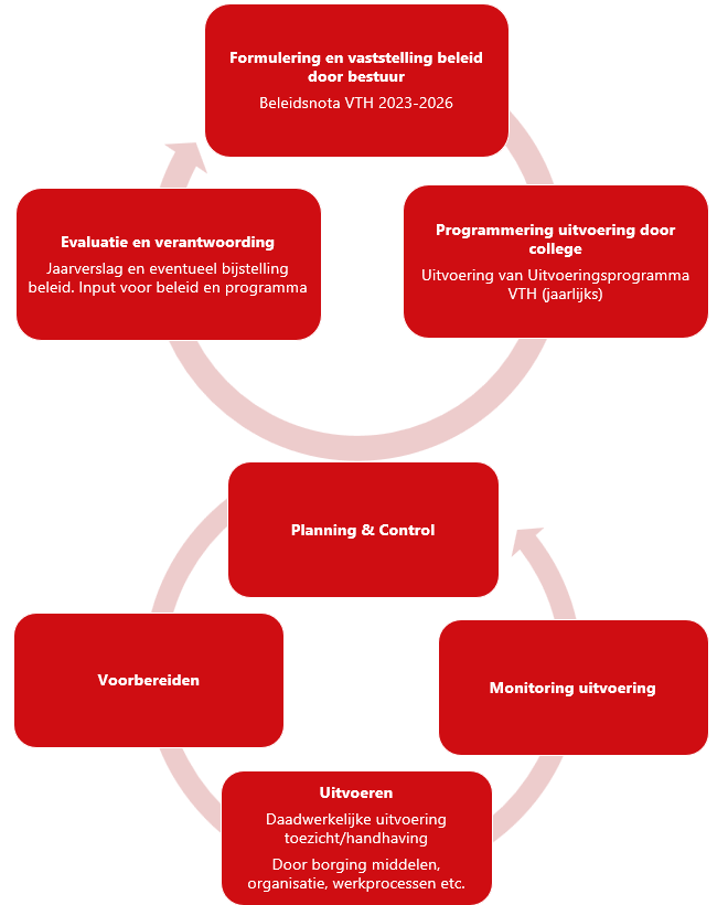 De VTH-beleidscyclus (Big-8) gaat over het opstellen van een beleidsplan (omgevingsanalyse, prioriteiten, doelen), een jaarlijks uitvoeringsprogramma met een planning van instrumenten en in te zetten capaciteit, de feitelijke uitvoering en monitoring daarvan (verslaglegging en evalueren). Het vorenstaande is een cyclisch proces. Dit jaarverslag is een jaarlijks op te stellen verslag, als bedoeld onder ‘Evaluatie en verantwoording’.