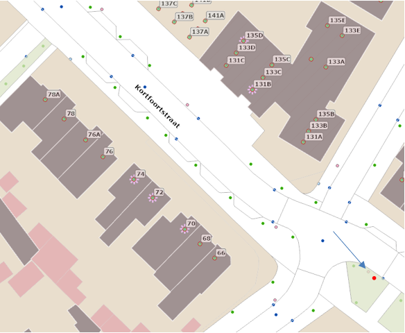 De gekozen locatie is de rode stip (ter hoogte van nummer 64)