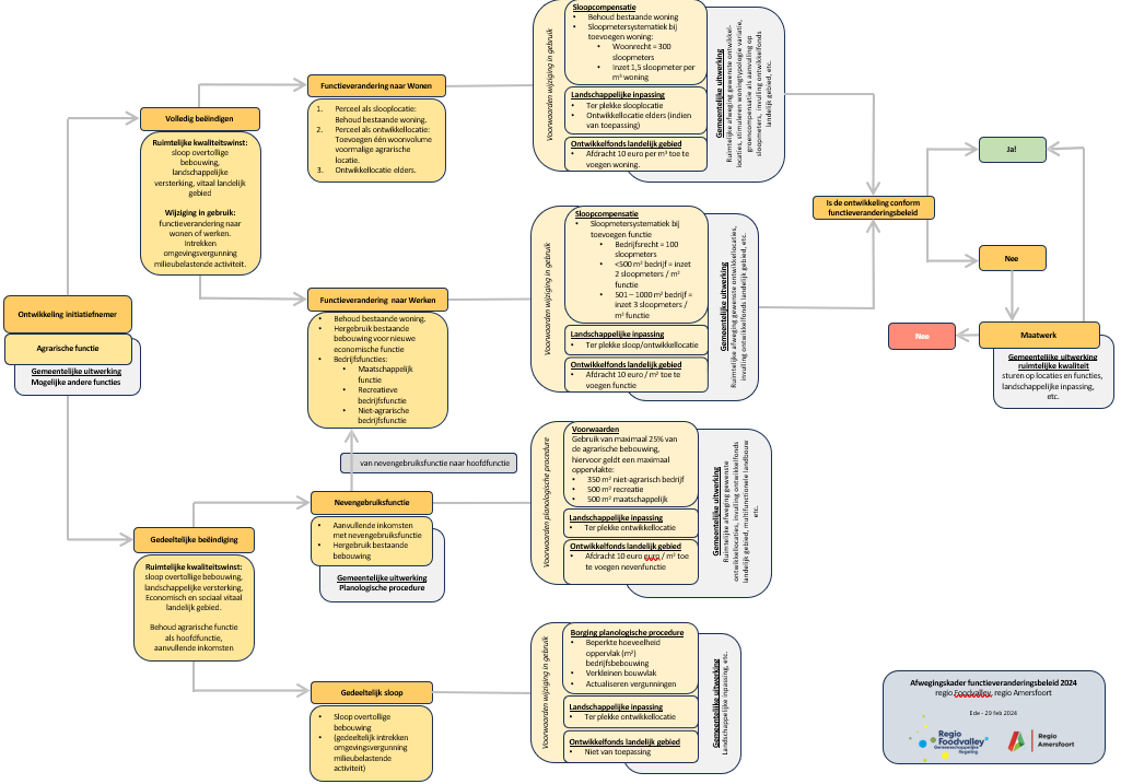 Aan de hand van het stroomschema beschrijven we het beleid voor de twee vormen van functieverandering bij volledige beëindiging van de agrarische functie: functieverandering naar wonen en functieverandering naar werken. Voor beide mogelijkheden zetten we de voorwaarden uiteen aan de hand van de regels voor sloopcompensatie, landschappelijke inpassing en bijdrage aan het ontwikkelfonds landelijk gebied. De regionale afspraken hebben ruimte voor een gemeentelijke uitwerking. Dit is herkenbaar in een grijs kader opgenomen bij de relevante onderdelen.