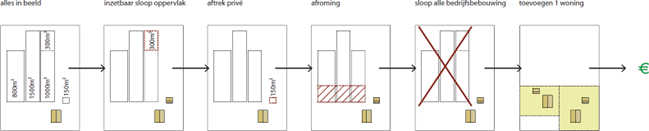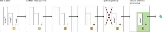 Door middel van het toepassen van de sloopmetersystematiek (zie hoofdstuk 3) wordt de gesloopte bedrijfsbebouwing omgezet naar inzetbare sloopmeters. De inzetbare sloopmeters kunnen vervolgens op het eigen perceel ingezet of verhandeld worden zodat het elders ingezet kan worden.