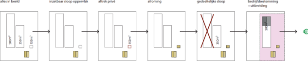 Tenslotte wordt de evenredige afroming afgetrokken van de te slopen bebouwing zodat inzetbare sloopmeters ontstaan uit deze gedeeltelijke functieverandering. Als het overige deel van het bedrijf in de toekomst beëindigd wordt, dan wordt de resterende afroming verrekend.