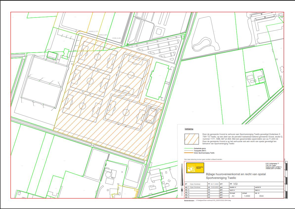De gemeente Voorst is van plan om gronden op het sportcomplex aan de Zuiderlaan in Twello op een deel van de percelen met de kadastrale aanduidingen gemeente Voorst, sectie Q, nummers 1177, 1068, 607 en 604 met een oppervlakte van ongeveer 71.229 m² aan één gegadigde te verhuren met een hiervan afhankelijk opstalrecht.