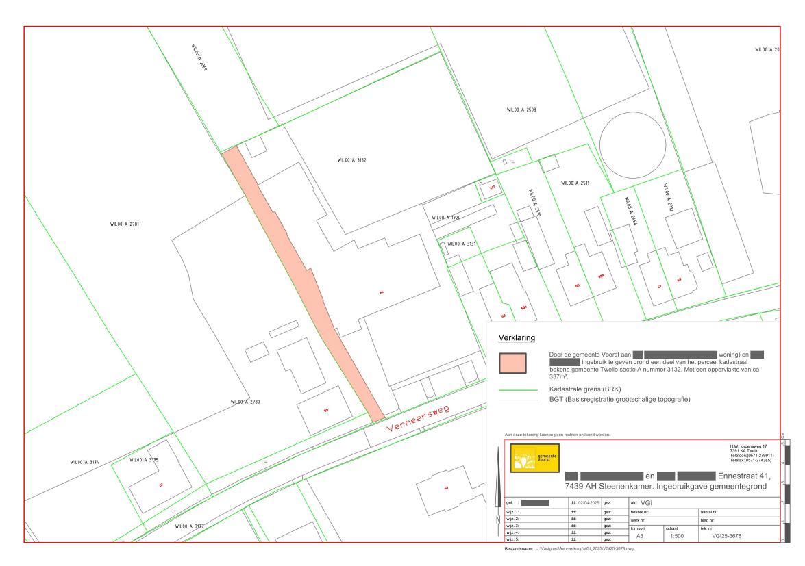 De gemeente Voorst is van plan om een gedeelte van een perceel gemeentegrond naast de Vermeersweg 59 in Twello met de kadastrale aanduiding gemeente Wilp, sectie A, nummer 3132 en een oppervlakte van 337 m² aan één gegadigde in bruikleen uit te geven.