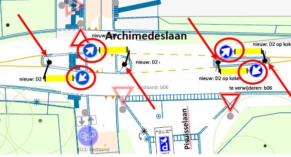 ter verbetering van de verkeersveiligheid en geleiding van het verkeer op de Archimedeslaan ter hoogte van de kruising met de Pisuisselaan extra middengeleiders geplaatst zijn;