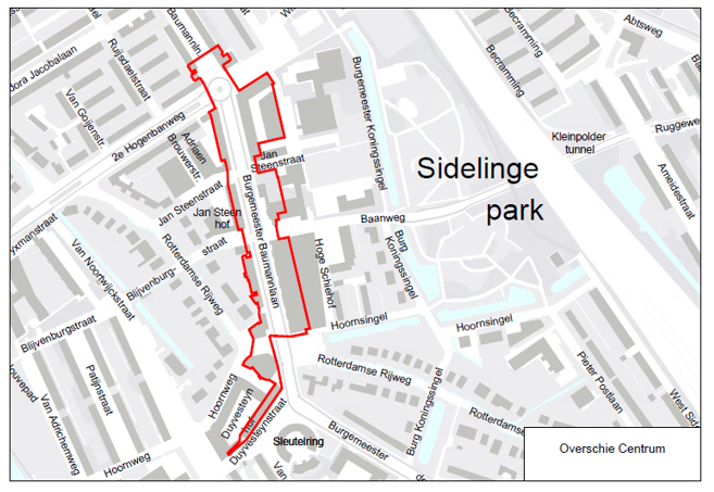 Als aangewezen gebied als bedoeld in artikel 1 van de Verordening bedrijveninvesteringszone gebruikers Overschie Centrum 2025 geldt onderstaande omschrijving zoals tevens aangeduid op onderstaande kaart.