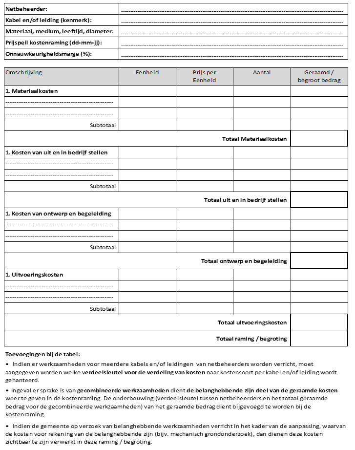 Kosten van civieltechnische, bouwkundige en installatietechnische werkzaamheden zijn bijvoorbeeld werkputten en ondersteuningen. Alle tijdelijke voorzieningen van fysieke aard die nodig zijn tijdens de bouw vallen onder de uitvoeringskosten. Onder tijdelijke voorzieningen van fysieke aard worden alle tijdelijke fysieke leidingverbindingen verstaan die de netbeheerder moet aanleggen en later buiten bedrijf moet stellen. Deze kosten houden nauw verband met de noodzakelijke continuïteit van het bedrijfsproces van de betrokken netbeheerder. Het betreffen voorzieningen die worden opgeheven zodra de definitieve maatregelen zijn gerealiseerd. De kosten die de aannemer moet maken om de leiding uit de grond te halen vallen onder uitvoeringskosten.