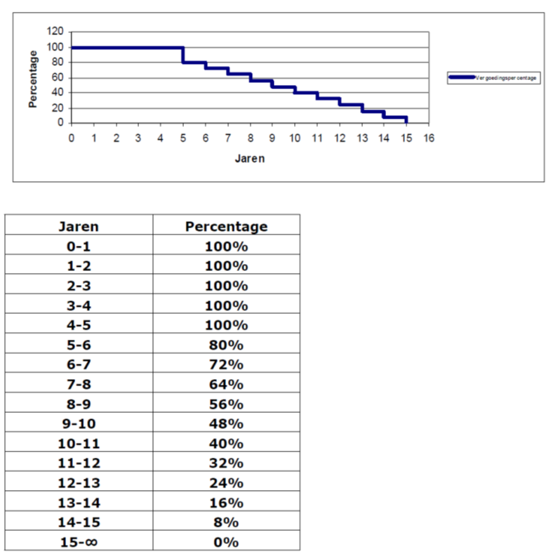 Voor droge infrastructuur geldt dat als de netbeheerder een verzoek, niet zijnde vitale kabels of leidingen, ontvangt na vijf jaar tot en met vijftien jaar, gerekend vanaf de datum waarop toestemming is verleend, de gemeente 80% van het schadebedrag na vijf jaar tot 0% na vijftien jaar (trapsgewijs) als nadeelcompensatie zal uitkeren volgens het schema weergegeven in bijlage 2.