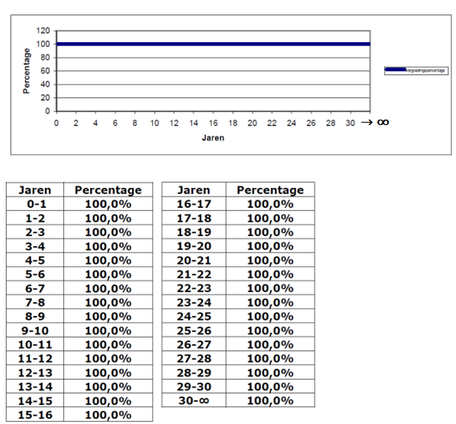 De nadeelcompensatie bedraagt 100% van het schadebedrag (zie bijlage 4), indien: