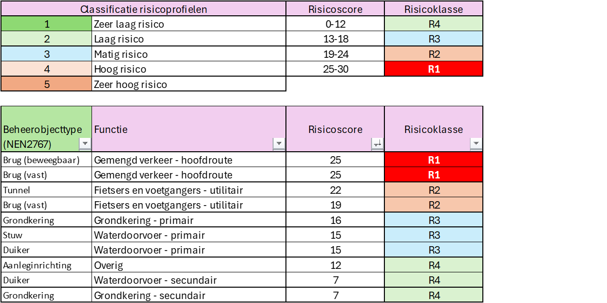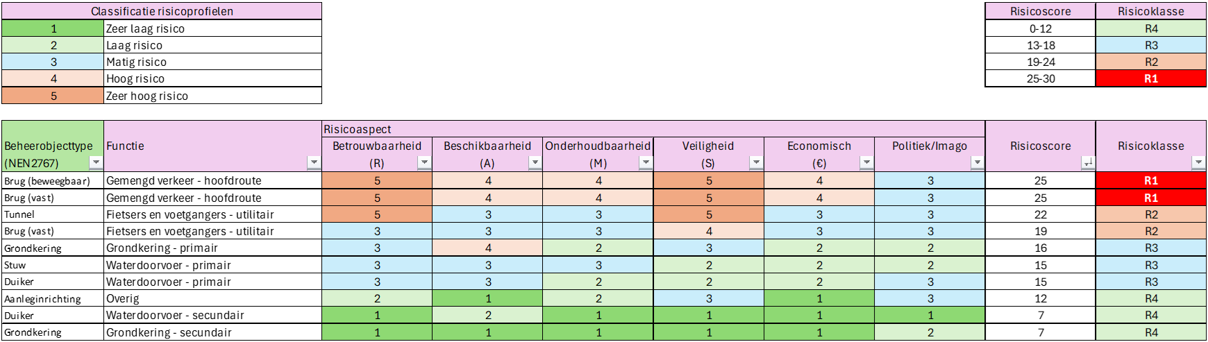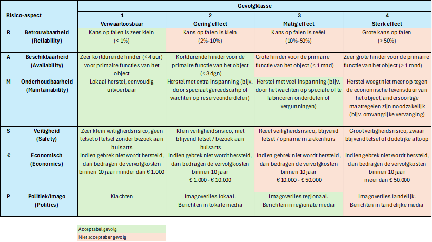Om efficiënt invulling te geven aan de gestelde kaders wordt uitgegaan van een risico gestuurde benadering op basis van conditiescores. Door voor verschillende risicoaspecten een acceptabel risiconiveau te benoemen kan worden beoordeeld of en wanneer onderhoud of vervanging van (delen van) kunstwerken noodzakelijk is. Risico is daarbij het product van de kans dat een (onderdeel van een) kunstwerk faalt en het effect van dat falen op een bepaald aspect van functioneren (Risico = Kans x Gevolg). De kans op falen wordt bepaald vanuit gegevens of expertise (zoals inspecties). Voor het bepalen van het gevolg van falen wordt gebruik gemaakt van de landelijk veel toegepaste methode van RAMSSHE€PS voor risicogestuurd beheer. In bijlage 8.5 is deze methode nader omschreven. Voor de beoordeling van de prestaties van onze kunstwerken wordt uitgegaan van onderstaande risicoaspecten.