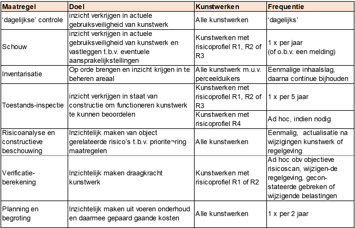 Het streven is om hinder en overlast te beperken tot incidentele gevallen. Dat betekent dat het beheersysteem en het inzicht in de onderhoudstoestand van de kunstwerken op orde moet zijn. Alleen zo kunnen immers hinder en overlast door calamiteiten worden beperkt en kan planmatig onderhoud zoveel mogelijk worden uitgevoerd in combinatie met bijvoorbeeld wegenonderhoud.