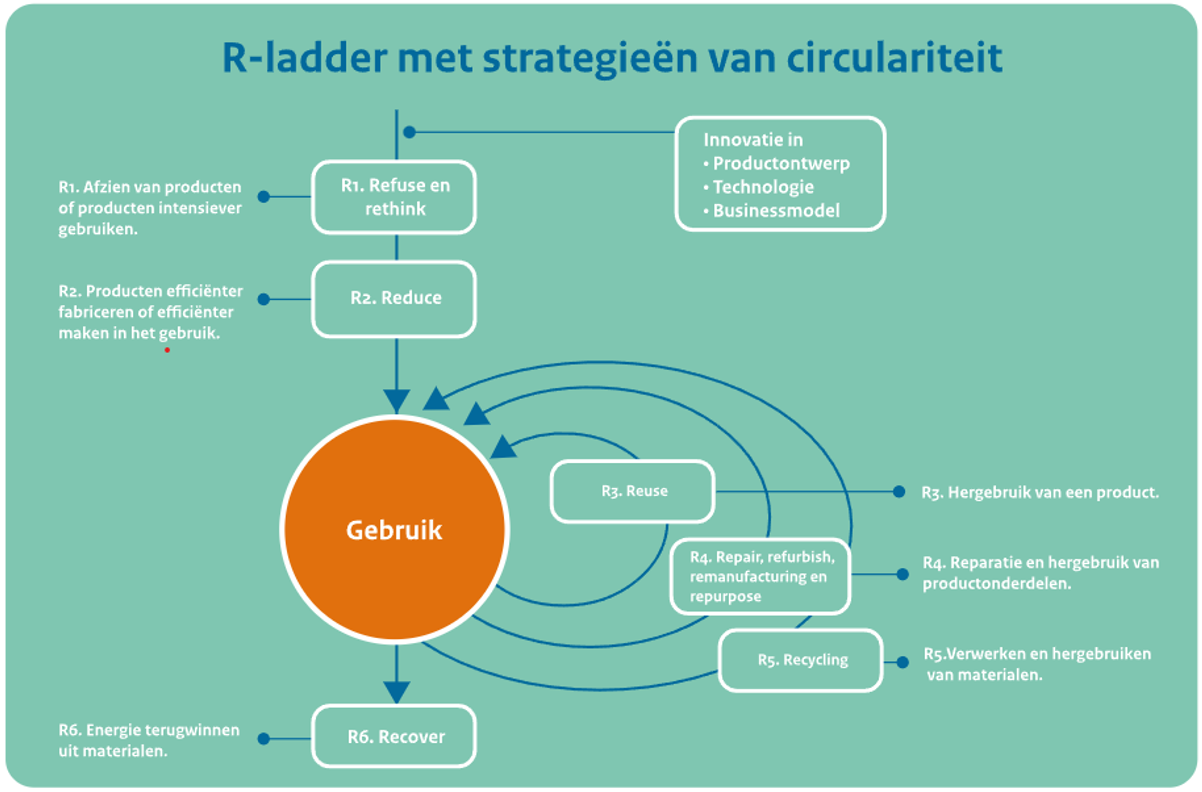 De R-ladder geeft de mate van circulariteit aan. De R-ladder heeft 6 treden (R1 tot en met R6) die verschillende strategieën van circulariteit weergeven. Strategieën hoger op de ladder, besparen meer grondstoffen. Hoe hoger een strategie op de R-ladder staat, hoe meer circulair de strategie is. Waarbij R1 de hoogste trede is. Hieronder lichten wij de 6 aanpakken toe.