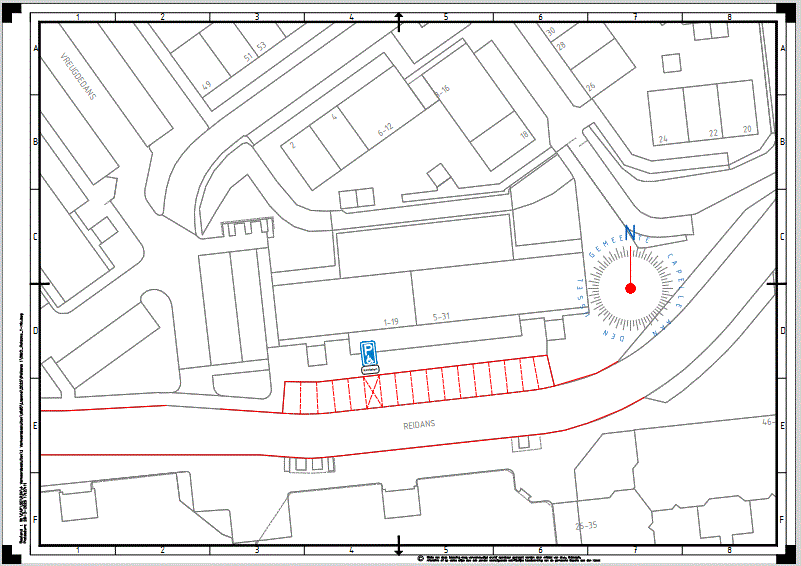 één parkeerplaats gelegen in de Reidans ter hoogte van huisnummer 1, nabij de woning van de aanvrager, als gehandicaptenparkeerplaats op kenteken te reserveren door het plaatsen van de verkeersborden E06 (Gehandicaptenparkeerplaats) in combinatie met onderbord OB309 op kenteken van het voertuig van Bijlage I van Reglement Verkeersregels en Verkeerstekens 1990;