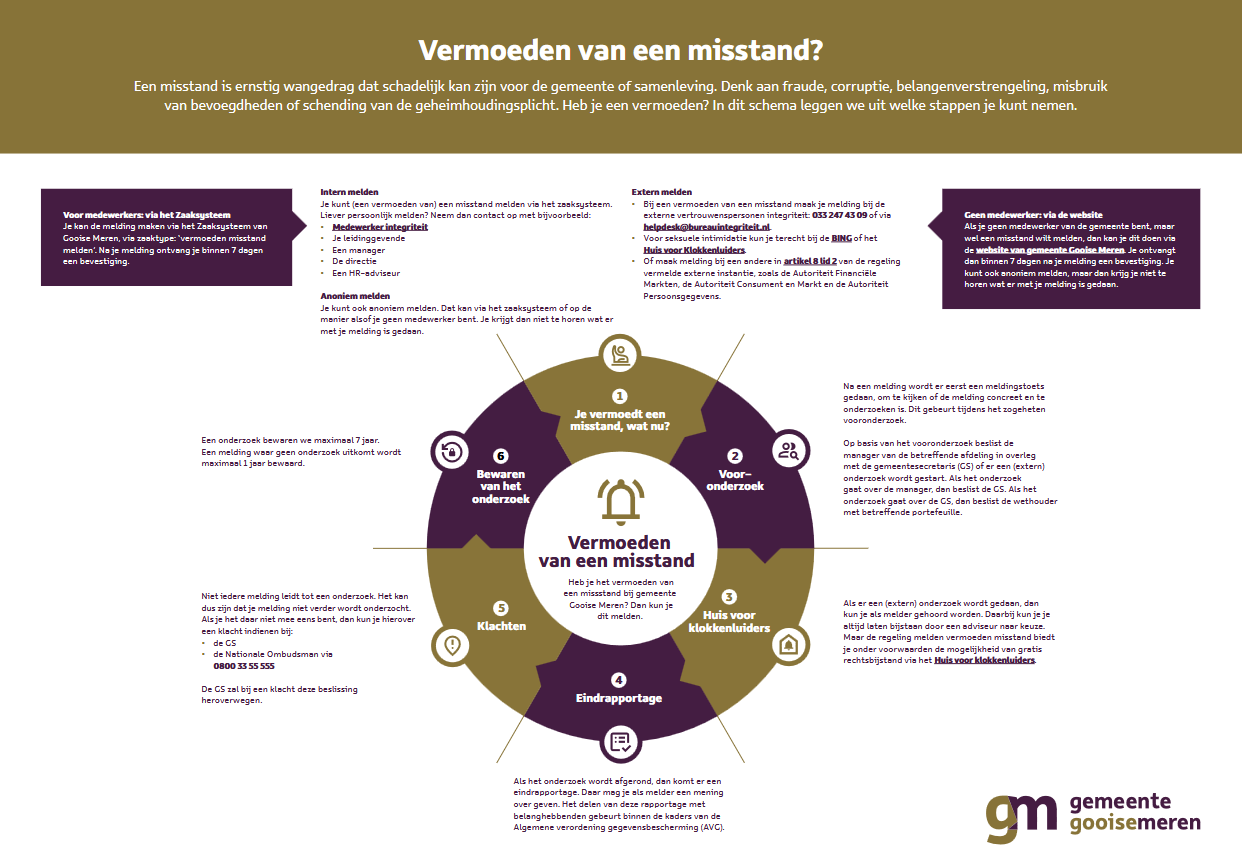 Als je vermoedt dat er sprake is van een misstand van maatschappelijk belang door de organisatie of een werknemer van de Gemeente Gooise Meren. Een persoonlijk conflict op de werkvloer is geen misstand van maatschappelijk belang. Fraude of een privacyschending is dat bijvoorbeeld wel.