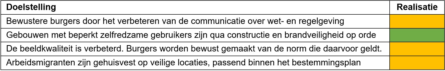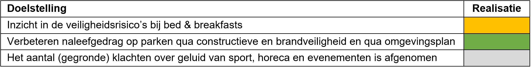 Er is geen registratie over de realisatie van de doelstellingen ten aanzien van recreanten. Het inzicht in de veiligheidsrisico’s is er alleen bij B&B’s waarvan meldingen of vergunningaanvragen zijn ontvangen. De evaluatie over 2021 laat zien dat naar aanleiding van de uitvoering van (toezicht)projecten, maatregelen (bouwkundig, plaatsen rookmelders) zijn genomen en is strijdigheid opgeven. Er is geen actuele informatie over de huidige situatie. Over de afname van klachten is geen informatie bekend. Dit komt omdat nog niet de gehele afdeling VTH met eenzelfde Workflow systeem werkt. Op dit moment werkt team Vergunningen met een goed registratie systeem (RxMission). Team Handhaving draait momenteel als proef met een follow-up systeem (werk dat buiten wordt geconstateerd zal direct in RxMission worden gezet) en team Handhaving zal waarschijnlijk in maart 2025 de overstap maken naar RxMission. Na team Handhaving zal ook het team OOV en team Ruimtelijke ordening met RxMission gaan werken.