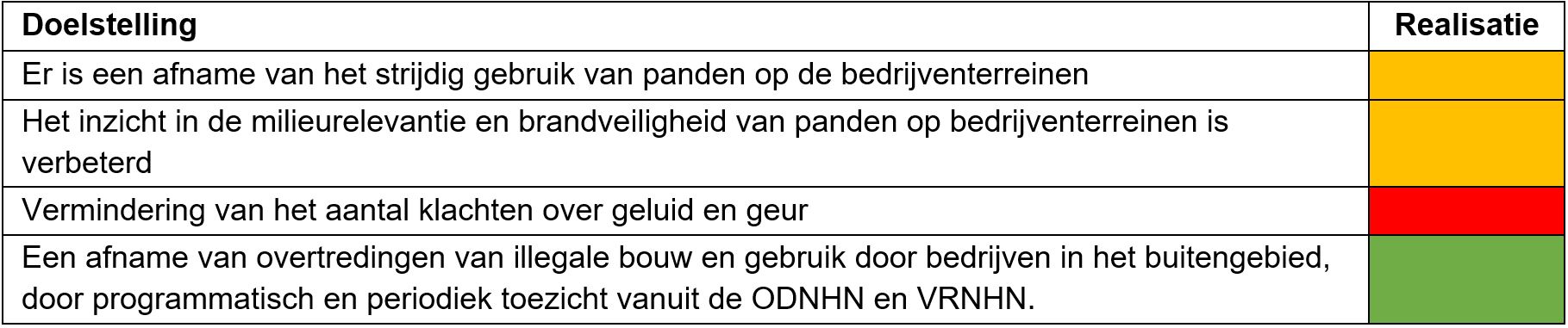 Er is geen monitoring van de geformuleerde doelstellingen. In algemene zin lijkt er geen afname van strijdig gebruik. Door het programmatische en periodieke toezicht vanuit de ODNHN en de brandweer is er meer inzicht in de milieurelevantie en brandveiligheid. Hier is echter geen systematisch overzicht van. Er blijven ook klachten over geluid en geur. Toezicht en handhaving blijven daar signalen over ontvangen. Bij diverse bedrijventerreinen lopen nu wel projecten voor verduurzaming en parkbeheer. Uit de evaluatie over 2021 bleek dat het naleefgedrag in het buitengebied verbeterd was en de doelstelling gerealiseerd. Er is geen actuele informatie over de vraag of die situatie is veranderd.
