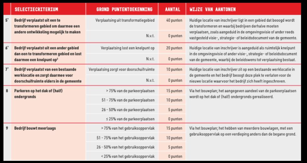 * Een inschrijving kan slechts op één van de criteria 5, 6 en 7 punten scoren. Wanneer een inschrijving aan meerdere van deze criteria voldoet, wordt het criterium met het hoogste aantal punten meegerekend.