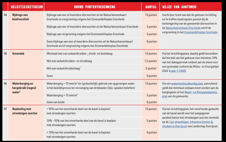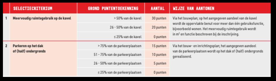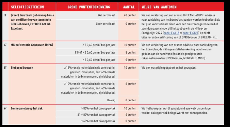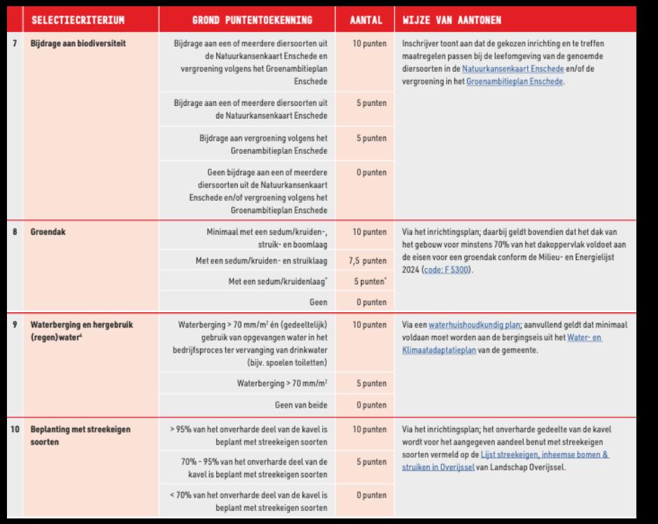 De criteria waarop inschrijvende partijen punten kunnen scoren zijn in dit uitgiftebeleid onderverdeeld naar vier thema’s: (1) strategisch economisch belang, (2) ruimtegebruik, (3) duurzaam en circulair bouwen en (4) klimaatadaptatie en biodiversiteit.