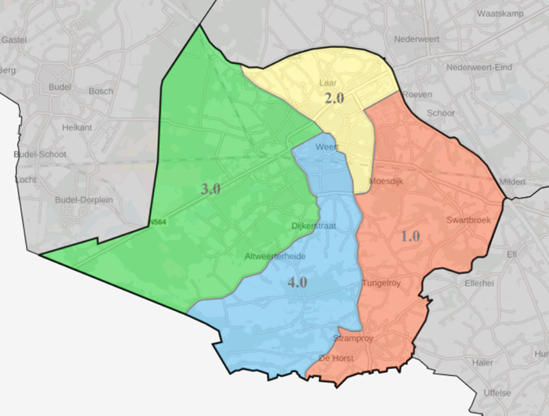 Na het inboeken van de aanvraag in het VTH-systeem vindt de intake en werkverdeling plaats door de administratieve ondersteuning op basis van de rayonindeling. Op de kaart hieronder is te zien hoe de gemeente is opgedeeld in vier vlakken.