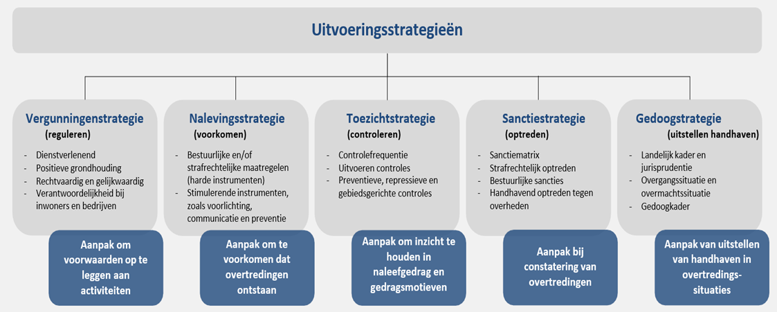 De werkwijze waarop wij de doelen en prioritair werken willen bereiken, is vastgelegd in de uitvoeringsstrategieën. De onderstaande strategieën zijn gebaseerd op landelijke strategieën (gedogen en sanctioneren) en zijn aangevuld met gemeentelijke strategieën. In de Uitvoeringsbundel worden de uitvoeringsstrategieën nader uitgewerkt.