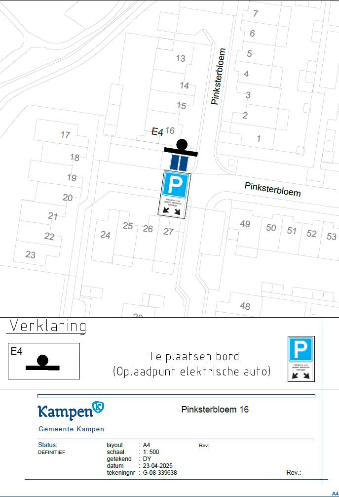 Verkeersbesluit gereserveerde parkeerplaatsen voor opladen elektrische voertuigen aan de zijkant van de Pinksterbloem 16 te Kampen