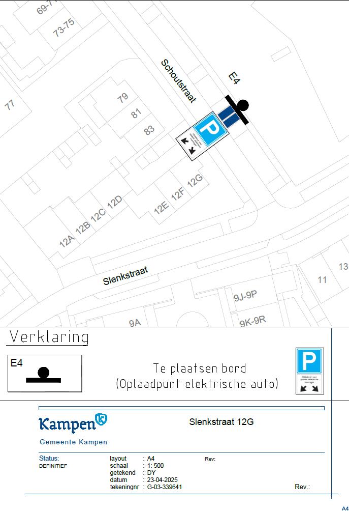 - door middel van het plaatsen van het verkeersbord E4 van bijlage 1 van het RVV 1990 met een onderbord met de tekst ‘opladen elektrische voertuigen’ – en een onderbord met pijlen, waaruit blijkt dat het bord voor twee parkeerplaatsen van toepassing is- op de Slenkstraat ter hoogte van nummer 12G, een tweetal parkeerplaatsen te reserveren op het aangrenzende parkeerterrein ten behoeve van het opladen van elektrische voertuigen.
