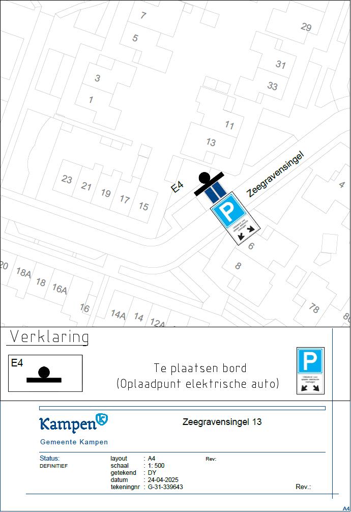 - door middel van het plaatsen van het verkeersbord E4 van bijlage 1 van het RVV 1990 met een onderbord met de tekst ‘opladen elektrische voertuigen’ – en een onderbord met pijlen, waaruit blijkt dat het bord voor twee parkeerplaatsen van toepassing is- op de Zeegravensingel ter hoogte van nummer 13, een tweetal parkeerplaatsen te reserveren op het aangrenzende parkeerterrein ten behoeve van het opladen van elektrische voertuigen.