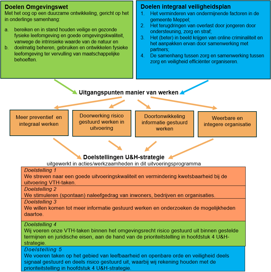 Zoals in de U&H-strategie is aangegeven, is vergunningverlening, toezicht en handhaving geen doel op zich. Het zijn middelen om bij te dragen aan wettelijke (verbeter)doelen en bestuurlijke ambities, waaronder het coalitieakkoord, de Koers, visie op participatie en het programma dienstverlening. Met uitgangspunten, doelstellingen en prioriteitstelling wordt in de U&H-strategie verder richting gegeven voor de manier van werken in de uitvoeringspraktijk.