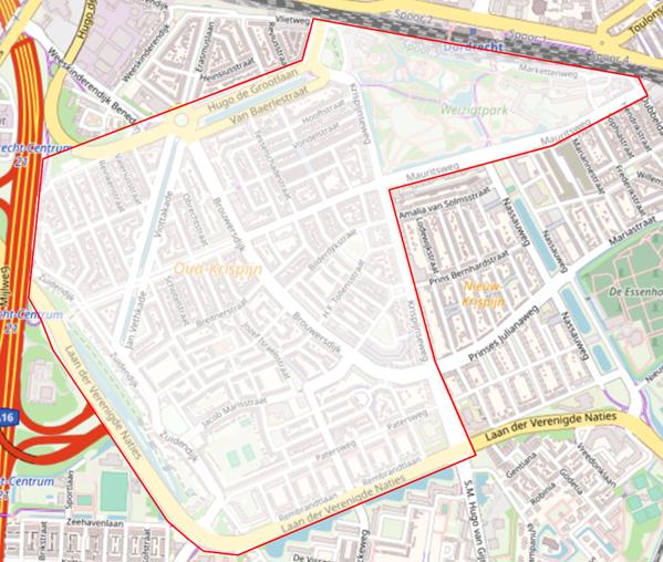 Het gebied binnen de wijk Oud-Krispijn dat wordt begrensd door de straten: Laan der Verenigde Naties, Diepenbrockweg, Hugo de Grootplein, Hugo de Grootlaan, Spuiweg, achterzijde station, Markettenweg, Dubbeldamseweg Zuid, Mauritsweg, Krispijnseweg, de genoemde wegen, oevers en aanwezige knooppunten van het openbaar vervoer daarbij inbegrepen.