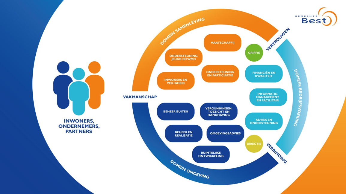 In 2024 hebben we onze organisatie heringericht om efficiënter en beter georganiseerd te werken binnen de gemeente Best. De nieuwe structuur bestaat uit drie domeinen: Omgeving, Bedrijfsvoering en Samenleving. Het domein Omgeving omvat nu onder andere de teams Vergunningverlening, Toezicht en Handhaving (VTH), Omgevingsadvies en Ruimtelijke Ordening. Deze teams zijn verder onderverdeeld in clusters en worden geleid door een teamleider. De cluster Veiligheid is verplaatst naar het domein Samenleving en de cluster Milieu is geïntegreerd in het team Omgevingsadvies. Deze herstructurering moet nog worden doorontwikkeld om een duidelijkere taakverdeling en verantwoordelijkheden te realiseren. Met als doel te zorgen voor een betere focus en specialisatie binnen de teams en daarbij aan te sluiten om de leefomgeving in de Gemeente Best te optimaliseren. Het organogram is schematisch weergegeven in Bijlage II.